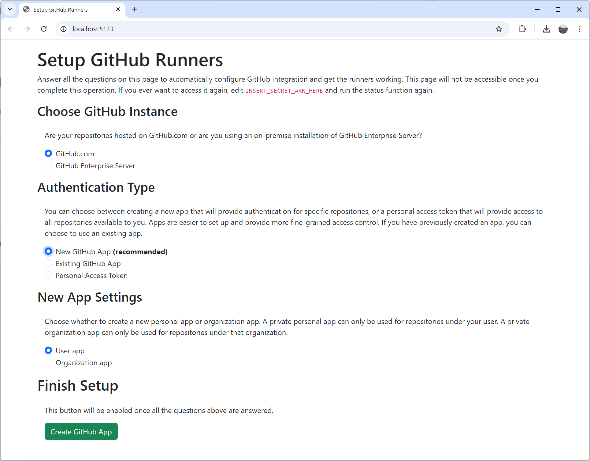 I created cdk-github-runners. I had fun playing with new AWS features, but mostly focused on making it as easy to install as possible. It deploys in a few minutes with the default configuration. After deployment you end up with a fancy browser-based setup wizard. It even uses app manifests to create the GitHub app automatically. This means there is zero room for errors with secrets because you don’t have to copy around multiple random keys and tokens. And then to top it all off, there is a solid API to customize the runner image and add dependencies or configuration. It can create on-demand runners for you on EC2, ECS, Fargate, CodeBuild and even Lambda (because why not?). Runner images are built in AWS itself so you don’t need to wait hours for it to build and upload from your computer. Refreshed images are built on a schedule so you are always up-to-date.